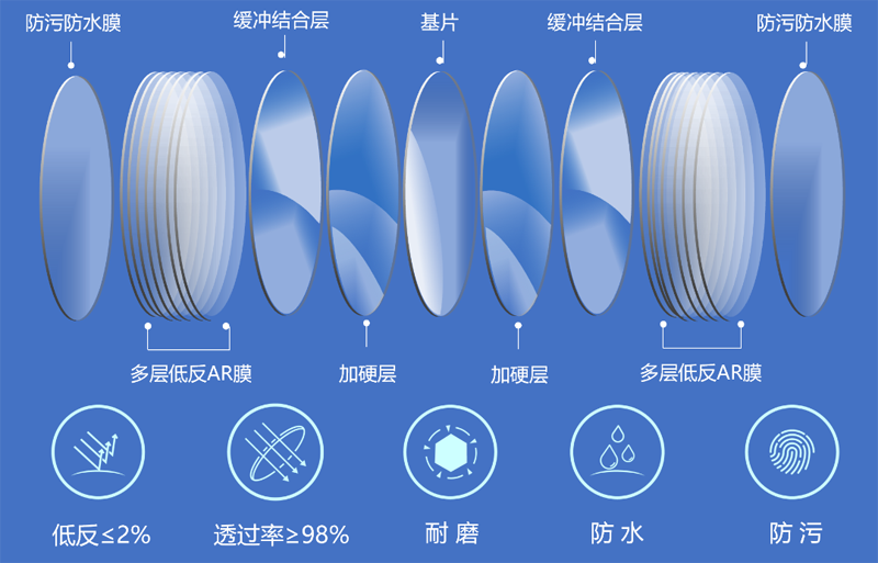 星立方铂金膜 采用先进镀膜设备,双面复合减反射镀膜,镜片膜层可达98%以上透过率,双面膜层反射率≤2%。同时具备防水耐污耐磨损五大特点,使其拥有更多防护力,镜片更耐用。